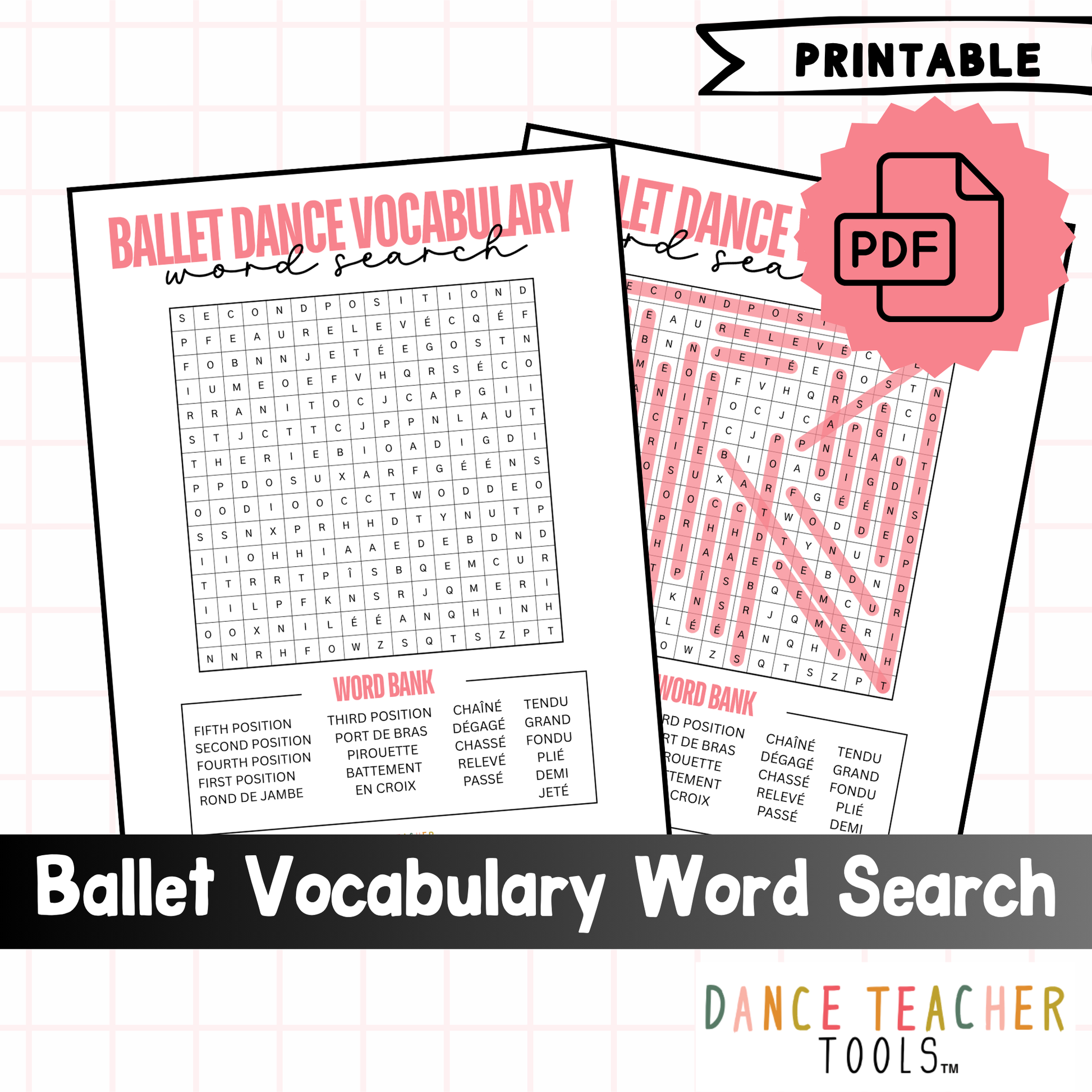 Make learning ballet vocabulary fun and engaging with this printable ballet vocabulary word search worksheet! This 2-page PDF download includes a student activity page featuring 21 beginner ballet terms, plus a complete answer key — perfect for dance teachers, studio instructors, and classroom educators who want a no-prep resource to reinforce dance terminology.
